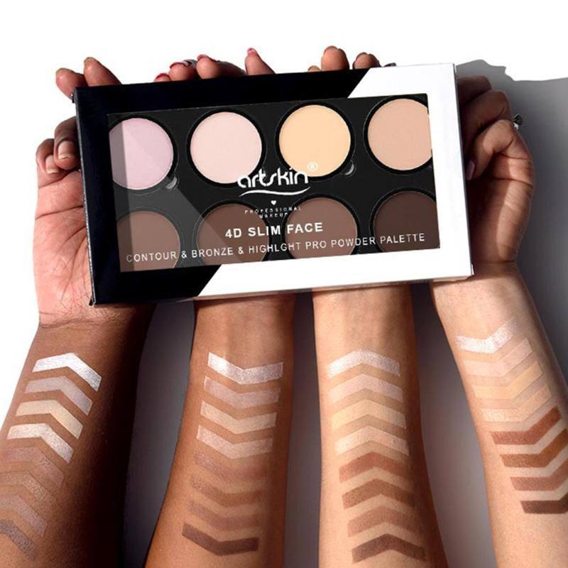 پالت کانتور و هایلایتر آرت اسکین مدل 4d slim face دارای هشت رنگ می باشد که در آن یک رنگ براق و یک رنگ نیمه براق و 6 رنگ کاملا مات بوده و از آنها برای طراحی و بعد دهی به صورت استفاده می شود. این پالت شامل تمامی رنگهایی است که برای ایجاد بعد در صورت نیاز دارید. این پالت مجموعه ای شامل هشت فرمول ترکیبی برای ایجاد و برجسته سازی در گریم صورت است. رنگهای تیره برای سایه زدن و به وجود آوردن عمق است. رنگهای روشن برای خلق نمای برجسته در پالت در نظر گرفته شدهاند